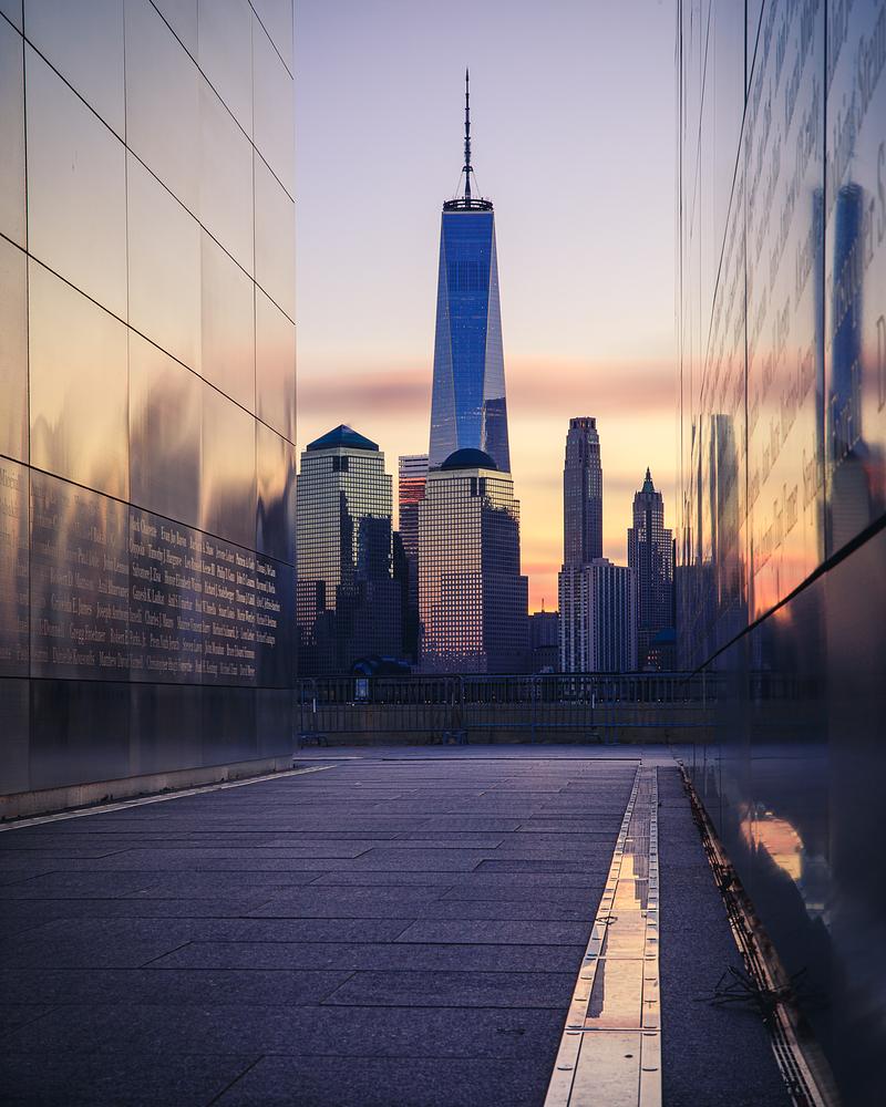 Sunrise lightning up the Empty Sky Memorial, Jersey City - New Jersey